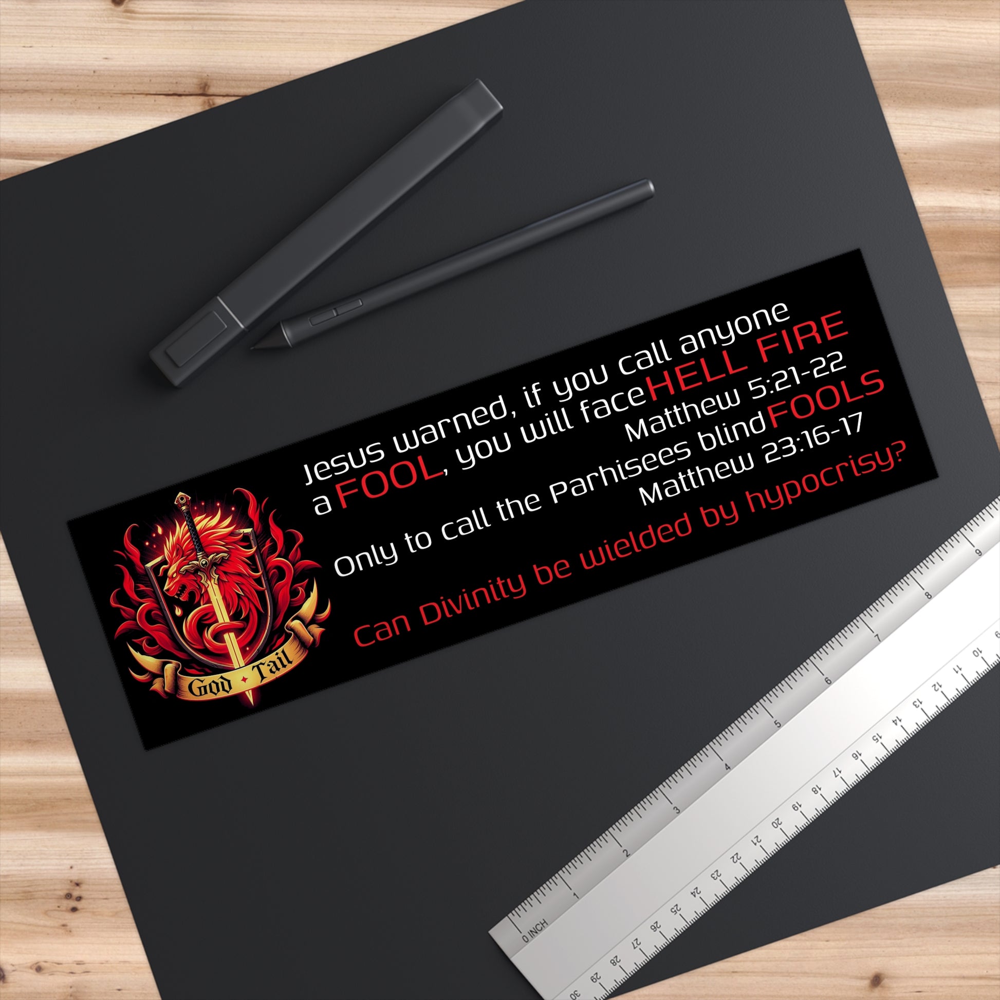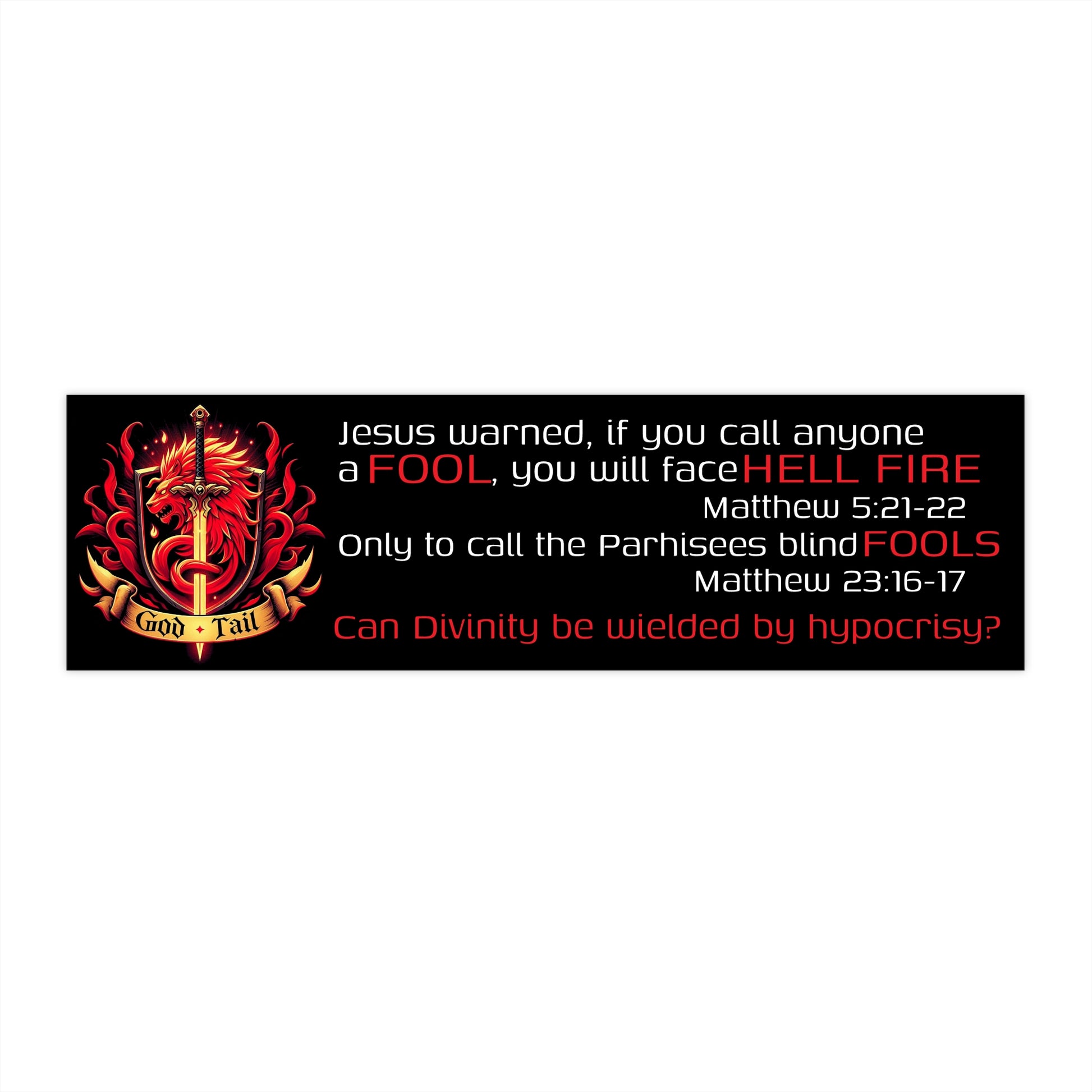 This religious bumper sticker challenges the inconsistency of Jesus warning against calling others fools while he himself does so. It adds a thought-provoking element to your car or laptop. Perfect for individuals who enjoy sparking conversations about religion and philosophy. Relevant for Easter, Christmas, or any religious observance.