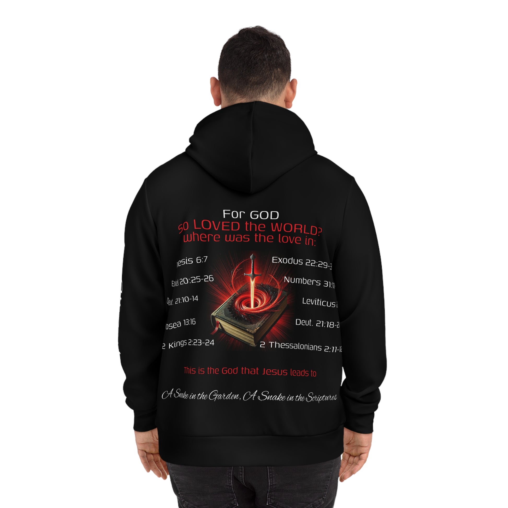 A religious hoodie that challenges the notion of a loving god, perfect for those who appreciate thought-provoking designs. This hoodie is ideal for individuals who enjoy making bold statements with their attire. Suitable for those who celebrate freedom of thought and expression.